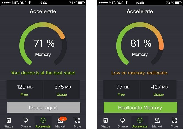 Дальше вам нужно найти раздел Accelerate, нажать на него, дождаться конца процесса сканирования. Получилось? Отлично, теперь Reallocate Memory (кнопка) – активна? Вам нужно проверить этот момент! Если он активна, то следует нажать на неё. А если приложение сообщило, что ваше устройство сейчас в наилучшем состоянии, то можно не волноваться.