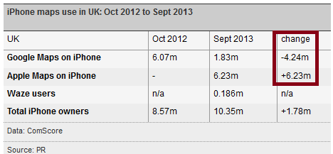 Однако даже в этой ситуации Apple Maps сумели достичь вершины популярности, обогнав всеми известные Google Maps. Правда такая тенденция, на данный момент, наблюдается только на территории США и Великобритании. Еще в прошлом году карты компании Google пользовались популярностью у большинства жителей Великобритании. Но сейчас ситуация обернулась в другую сторону.