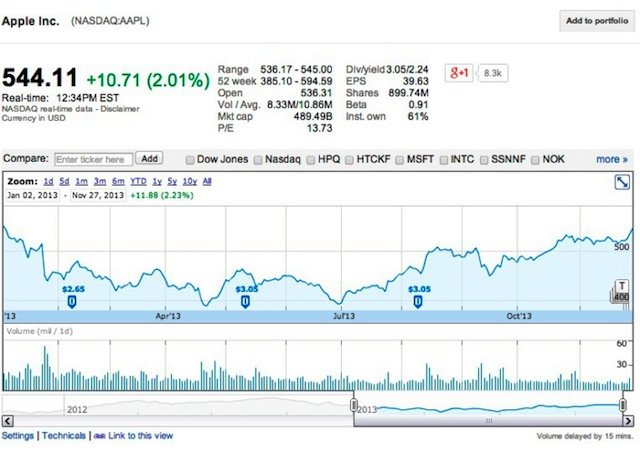 В последнее время замечалось колебание цены на акции Apple, однако на сегодняшний момент рост стабилизировался и уже приближается к максимальному показателю за текущий год, который составил $549.