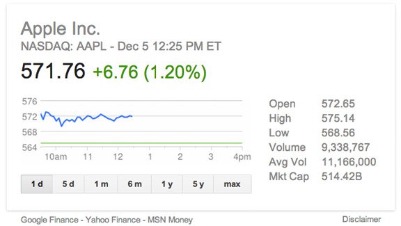 Сегодня, на торгах Nasdaq акции компании Apple подпрыгнули до рекордного показателя в 2013 году. Рекордная стоимость акций составила $575,14 за одну единицу.