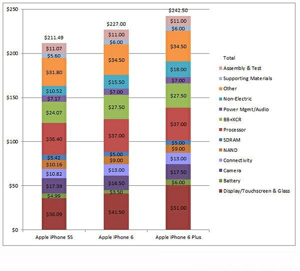 Проведенный анализ показал, что на компоненты и сборку iPhone 6 Plus компания потратила 242,5 долларов. А это, в свою очередь, оказалось на 15% больше, нежели сборка и «начинка» предыдущего айфона 5S. Что касается iPhone 6, то, по словам экспертов, затраты на его выпуск составляют 227 долларов.