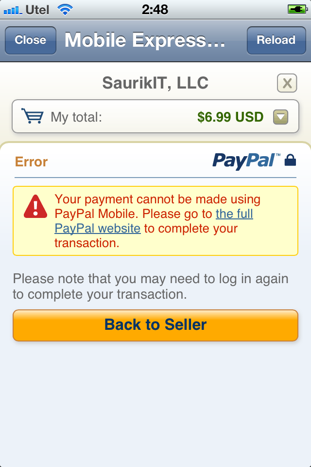 Если выдало ошибку, перейдите на сайт для ПК по предлагаемой системой ссылке (Please go to the full PayPal website…)
