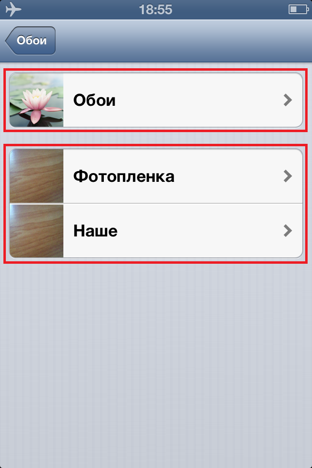 Далее перед вами два или более разделов, первое это «Обои», второе «Фотопленка» и другие альбомы с фотографиями, если вы их создавали.