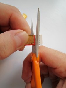Потом мы вспоминаем уроки труда и аккуратно по нанесённой линии вырезаем. Держите карту контактами к себе и не торопитесь. Нельзя затронуть контакты ножницами. В противном случае, как можно уже догадаться, карточка не будет работать. И её, после этого, будет можно только заменить у оператора. Учтите, что подобное стоит делать по максимуму аккуратно, поскольку если обрезать слишком мало, то остаток будет проблематично удалять(наждачка или напильник в помощь;)), а вместе с лишней частью пластика карточка уже никуда не поместится. Слишком много – велик шанс повредить контакты, как уже говорилось.