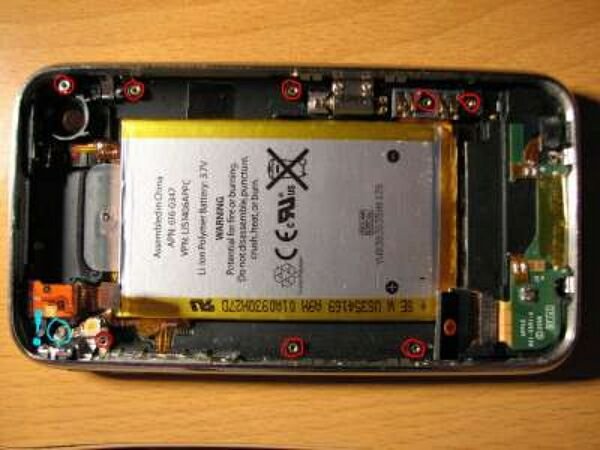 5. Аккуратно отключите и остальные коннекторы айфона. Открутите все винты на синей плате (даже помеченный биркой: «Не срывать!»). Не трогайте только тот из них, который на рисунке помечен голубым.