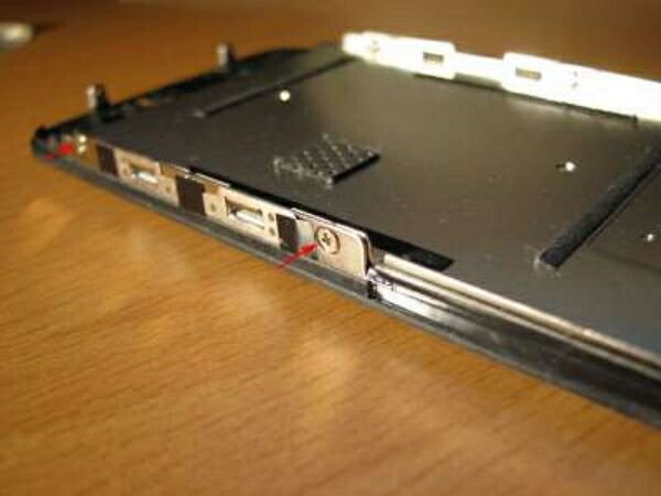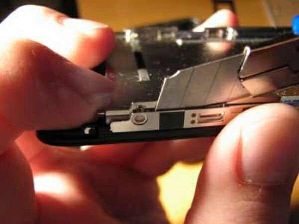 Чтобы до конца разобрать экран нужно вывернуть винты, на которых он крепится. Нож следует аккуратно просунуть между каркасом стекла и дисплея. Далее экран вытаскивается таким же образом, как плата.