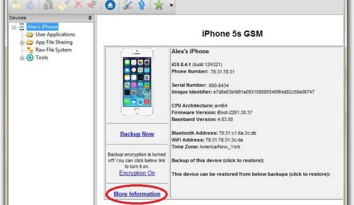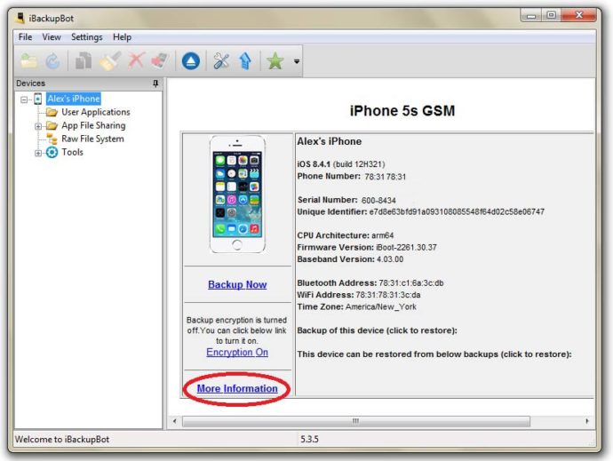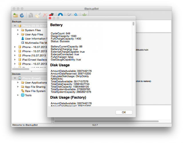 На смартфонах Apple есть возможность посмотреть точную статистику, сколько процентов ёмкости потерял аккумулятор за всё время работы. iPhone’ы собирают информацию о циклах заряда-разряда и анализируют её. Подготовленные данные предназначены для сотрудников сервисных центров, поэтому чтобы её увидеть, нужно установить программу iBackupBot (или подобную, предназначенную для получения полной информации об устройстве). Разобраться с работой программы несложно: достаточно поставить её на компьютер, запустить и подключить ваш iPhone через USB. iBackUpBot сам соединиться с вашим телефоном и отобразит все собранные данные. Нажмите на ссылку More Information, откроется окно с детализированными параметрами устройства. В разделе Battery найдите строчку BatteryCurrentCapacity: это число и есть ёмкость батареи в процентах.