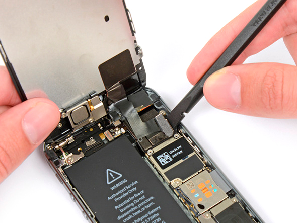 Открутите два винта, чтобы освободить экран - Теперь нужно поднять экран, а не заднюю крышку, как у iPhone 4/4s. Для этого используем iSlack либо комбинацию присоски и какого-нибудь тонкого и мягкого инструмента, чтобы поддеть экран снизу. Будьте аккуратны, чтобы не повредить кнопку Home. Затем, когда экран будет несколько приподнят над корпусом устройства, нужно отсоединить кабель, связывающий его с материнской платой. Аккуратно подденьте разъём и отцепите коннектор кнопки Home.