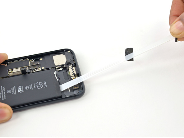 - После этого шага у нас, наконец-то, появляется доступ к аккумулятору IPhone 7. Он, как и в случае с 6-ого и 5-ого поколений, крепится на клейкие ленты. Вытащите чёрные пластиковые язычки и вытяните их из-под батареи по одному.