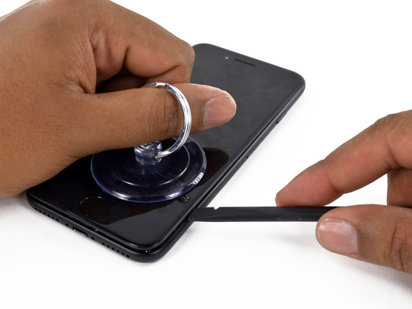 - Теперь снимаем экран. Используем iSlack либо комбинацию чего-то тонкого и мягкого и присоски. Приподнимаем экран со стороны кнопки Home.