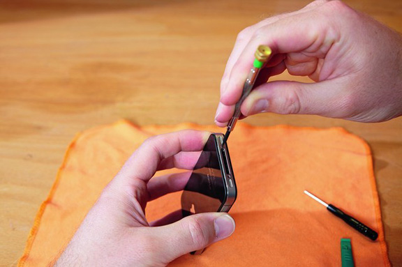 Открутите винты на нижней грани устройства - Затем, используя присоску и мягкую тонкую отвёртку либо приспособление iSlack, максимально аккуратно приподнимите экран вверх над кнопкой Home. Специалисты из iFixit рекомендуют разогреть устройство перед началом разборки. Используйте для этого фен, но следите, чтобы устройство не перегревалось.