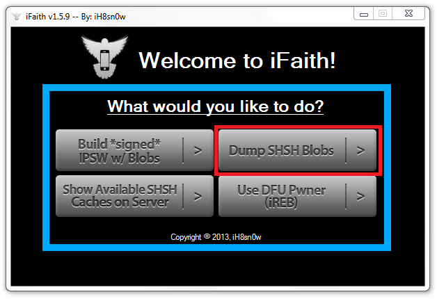 2. На первом экране приветствия нажмите «Ок». Далее нажмите Dump SHSH Blobs -> Proceed -> Let’s Go.
