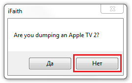 Появится табличка «Are you dumping an Apple TV 2», в ответ на которой нажмите Нет (но если у вас Apple TV 2, то жмите Да).