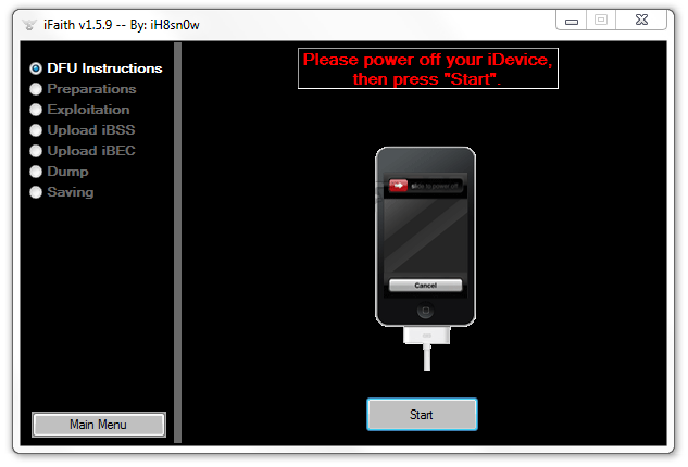 (После нажатия кнопки Start программа будет помогать вам вводить устройство в DFU, показывая сколько секунд и какую кнопку необходимо удерживать. Но если вы уже знаете как это делать, то можете ввести в DFU без нажатия Start, а после того как введете, нажмёте кнопку.)