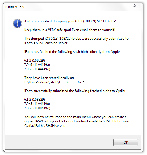 4. Начнется процедура извлечения ваших SHSH с сервера, в процессе которой утилита попросит вас выбрать место для сохранения SHSH, а по завершению появится информирующая табличка.