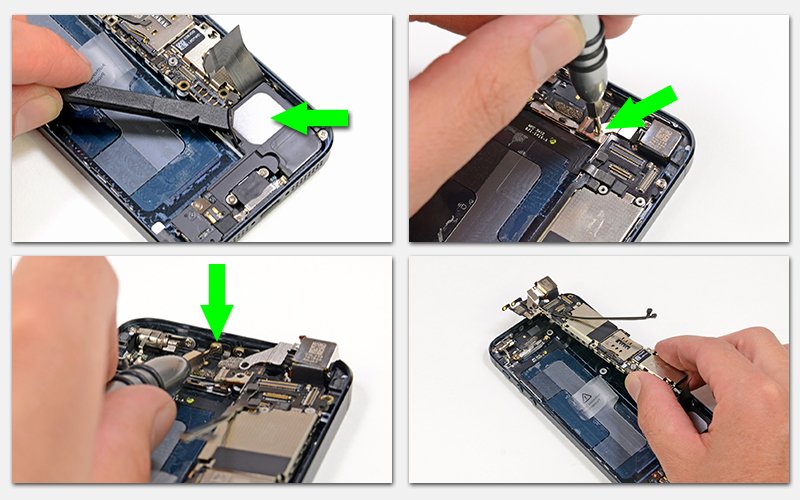 10. Следующим шагом снимем материнскую плату. Разницы между iPhone 5 и 5S нет. Отсоединяем модуль коннектора антенны от материнской платы. Откручиваем винты крепления платы к корпусу и контакты у внутренней стенки. Аккуратно вынимаем материнскую плату.