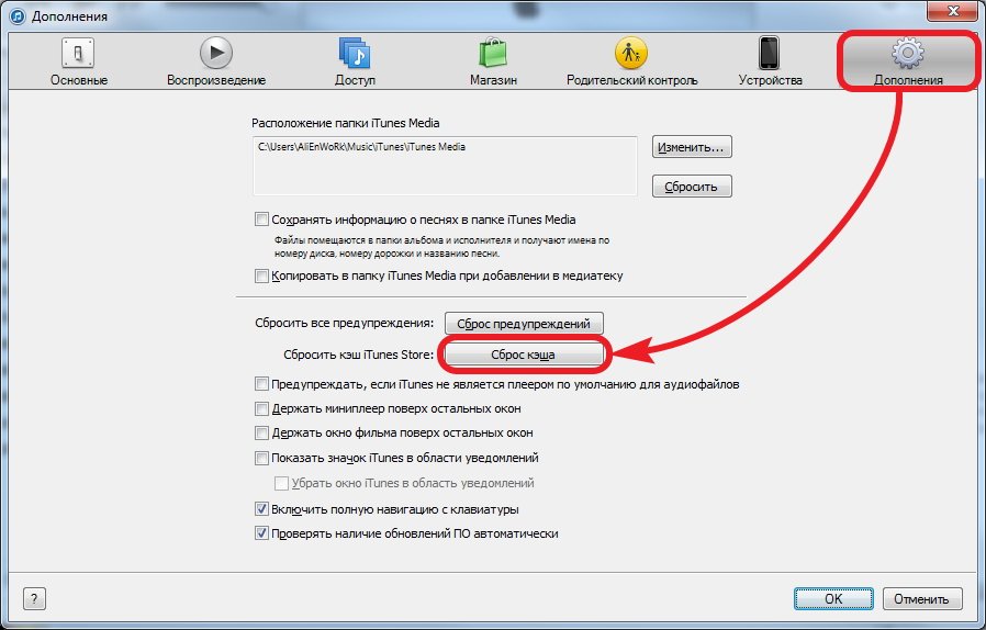 Традиционно профессионалы рекомендуют в самой программе iTunes почистить кэш. Как это сделать? Для начала откройте её, после чего перейдите в меню правки(если их не видно — нажмите Alt), дальше – в настройки(можно «Ctrl+,»), а потом уже и в дополнения. Там вы увидите сброс кэша – нажмите на эту кнопку. Программа очистит его довольно быстро, после чего у вас снова будут обновления. Если после очистки информация не появилась, обратитесь за помощью снова к горячим клавишам.