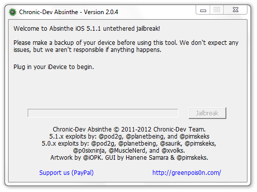 Инструкция по отвязанному джейлбрейку прошивок iOS 5.1.1 для всех устройств Apple на чипе A4, A5, A5X, с помощью утилиты Absinthe.